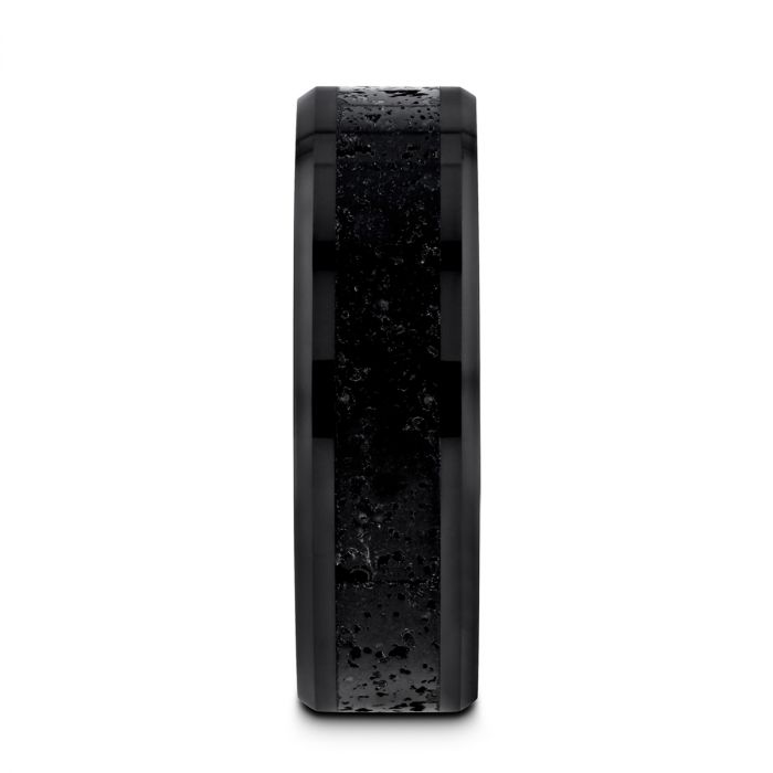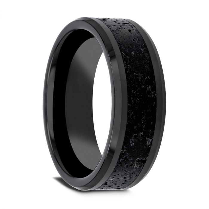 VESUVIUS Men’s Polished Black Ceramic Wedding Band with Black & Gray Lava Rock Stone Inlay & Polished Beveled Edges